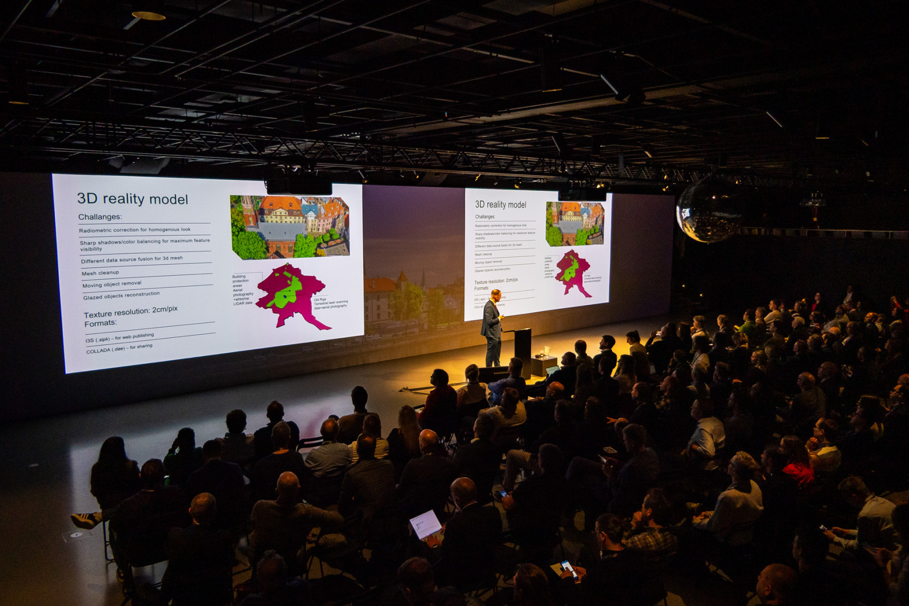 Prezentācijā tika demonstrēts, kā Rīgā tiek attīstīts pilsētas ģeotelpiskais digitālais dvīnis – integrēts 3D pilsētvides modelis, kas apvieno dažādus ģeotelpiskos datus vienotā sistēmā un kalpo gan pašvaldības ikdienas darba vajadzībām, gan sabiedrības informēšanai. Digitālais modelis ļauj: